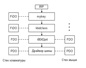 Все объекты FDO и FiDO позиционируют себя в стеке устройств. Порядок объектов в стеке определяет порядок обработки запросов ввода-вывода. Если необходимо перехватить и обработать запрос, непосредственно идущий от пользователя, то нужно устанавливать верхний фильтр. Если же нужно отслеживать обращение к портам ввода вывода, обрабатывать прерывания, то нужен нижний фильтр. Данная модель позволяет драйверу устанавливать callback процедуры. Когда запрос начинает обрабатываться, то он обрабатывается последовательно всеми драйверами стека устройства (исключая ситуацию, когда какой-либо драйвер сам завершит обработку запроса). После этого диспетчер ввода-вывода передает запрос callback процедуре каждого драйвера стека. Сначала запрос передается callback процедуре последнего драйвера который в стеке, потом процедуре предпоследнего драйвера и.т. д. Callback процедуры нужны для того, чтобы обработать прочитанную из устройства информацию. Если фильтр обрабатывает запросы на чтение, то когда этот запрос поступит в драйвер информация еще не будет считана. Поэтому драйверу необходимо установить callback функцию. При ее вызове запрос уже будет содержать считанные данные.