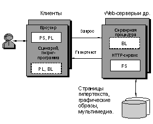Изначально технология Internet/Intranet/WWW предназначалась для облегчения доступа к информации и публикации документов (рисунок 1.1). Программа-клиент (броузер) выполняет функции интерфейса пользователя (диалоговый ввод-вывод PS и логика диалога PL) и обеспечивает доступ практически ко всем информационным ресурсам Internet/Intranet посредством HTTP-сервиса. База данных гипертекста - это часть файловой системы, которая содержит текстовые файлы в формате HTML и связанные с ними графику и другие ресурсы. Фактически, броузер является интерпретатором HTML-текста. И как типичный интерпретатор клиент в зависимости от команд разметки выполняет различные функции. В круг этих функций входит не только размещение текста на экране, но и обмен информацией с сервером по мере анализа полученного HTML-текста, что наиболее наглядно происходит при отображении встроенных графических образов. При анализе URL-спецификаций или по командам сервера клиент запускает дополнительные help-программы для работы с документами в форматах, отличных от HTML, например, GIF, JPEG, MPEG, Postscript и т.п. Кроме того, в гипертекст может быть встроен текст сценария на JavaScipt, VBScript и др., который расширяет логику диалога (PL) и обеспечивает простую прикладную обработку (BL). Броузер вызывает соответствующий интерпретатор для исполнения сценария.