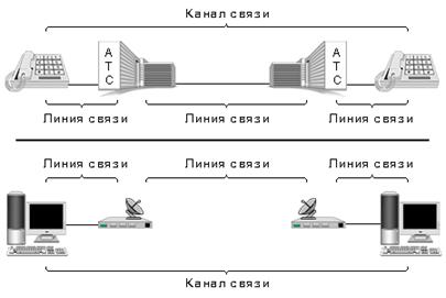 Линия связи состоит в общем случае из физической среды, по которой передаются электрические информационные сигналы, аппаратуры передачи данных и промежуточной аппаратуры. Синонимом термина линия связи (line) является термин канал связи(channel). Физическая среда передачи данных (medium) может представлять собой кабель, то есть набор проводов, изоляционных и защитных оболочек и соединительных разъемов, а также земную атмосферу или космическое пространство, через которые распространяются электромагнитные волны.