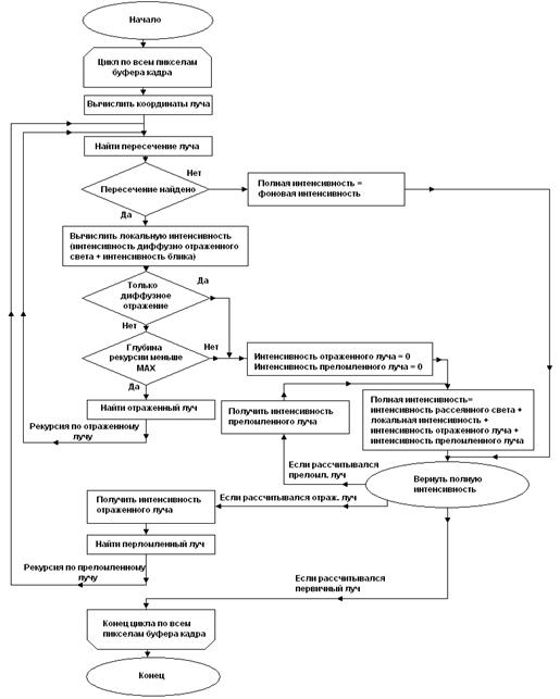 Рис. 2.1.1. Блок-схема рекуррентного алгоритма обратной трассировки лучей.