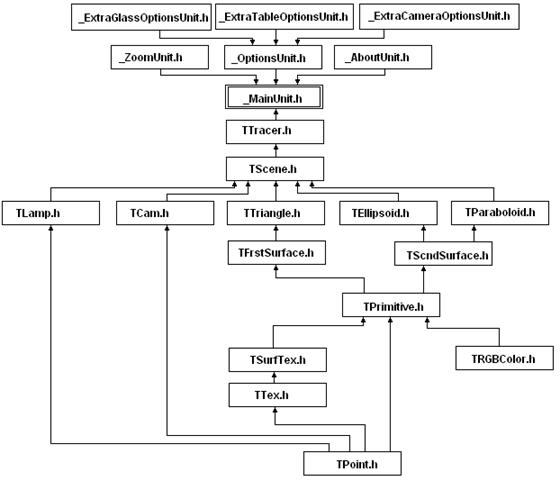class TScene – класс сцены. Содержит информацию о всех примитивах, источниках и камере.