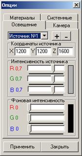 Интенсивность источника – значения трех компонент интенсивности источника света, выбранного в выпадающем списке.