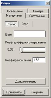 Коэф. диффузного отражения – коэффициент KD материала стакана (см. раздел 2.2.1). Коэф. преломления – абсолютный коэффициент преломления материала стакана. Дополнительно – при нажатии на эту кнопку появляется форма Свойства стекла с дополнительными параметрами материала стакана.