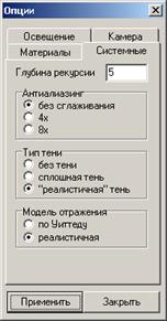 Глубина рекурсии – этот параметр устанавливает глубину рекурсии в алгоритме трассировки. При бОльших значениях этого параметра качество сгенерированного изображения улучшается.