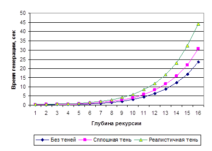 В этом тесте исследовалась зависимость времени генерации изображения от глубины рекурсии. Исследования проводились для сцены освещенной одним источником света.