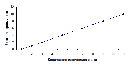 Во втором исследовании показано, что зависимость времени генерации от количества источников света линейна. Из полученных значений можно вычислить время, необходимое для расчета одного источника. На машине, на которой проводились исследования, при глубине рекурсии 5 это время примерно равно 0,8 секунды.