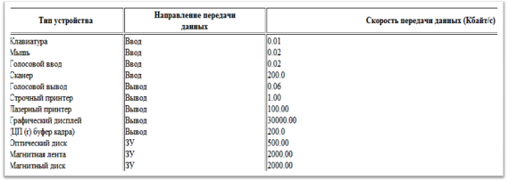 Как правило периферийные устройства компьютеров делятся на устройства ввода, устройства вывода и внешние запоминающие устройства (осуществляющие как ввод данных в машину, так и вывод данных из компьютера). Основной обобщающей характеристикой устройств ввода/вывода может служить скорость передачи данных (максимальная скорость, с которой данные могут передаваться между устройством ввода/вывода и основной памятью или процессором). На рисунке 3.27. представлены основные устройства ввода/вывода, применяемые в современных компьютерах, а также указаны примерные скорости обмена данными, обеспечиваемые этими устройствами.