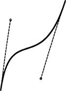 Кривые Безье. Это особый, упрощенный вид кривых третьего порядка (см. рис. 2). Метод построения кривой Безье (Bezier) основан на использовании пары касательных, проведенных к отрезку линии в ее окончаниях. Отрезки кривых Безье описываются восемью параметрами, поэтому работать с ними удобнее. На форму линии влияет угол наклона касательной и длина ее отрезка. Таким образом, касательные играют роль виртуальных «рычагов», с помощью которых управляют кривой.
