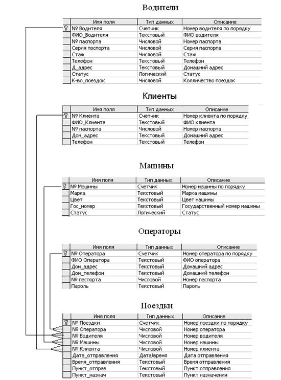 - таблица Машины, предназначенная для хранения информации о машинах принадлежащих таксопарку;