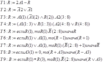 К подмножеству Y2 отнесем такие МО, в результате выполнения которых не происходит изменение содержимого регистра, но осуществляется передача в некоторую совокупность выходных шин кодов, которые зависят, в общем случае, и от содержимого регистра Рг, и от кодов на входных шинах. Эти МО описываются оператором присваивания вида: