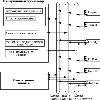Человек создавая компьютер где то в глубине себя думал что создает что то похожее на себя самого. У компьютера есть органы восприятия информации из внешнего мира — это клавиатура, мышь, накопители на магнитных дисках. На рис. 2 эти органы расположены справа от системных шин. У компьютера есть органы “переваривающие” полученную информацию — это центральный процессор и оперативная память. И, наконец, у компьютера есть органы речи, выдающие результаты переработки. Это также некоторые из устройств справа.