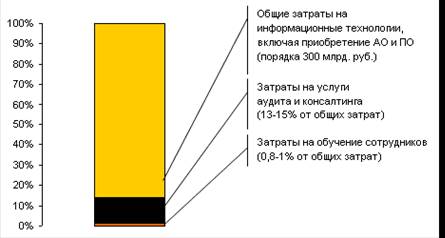 Существующий объем и структура рынка обеспечивается спросом на ИТ со стороны трех основных групп предприятий. В первую очередь, традиционно стоит отметить спрос со стороны ограниченного числа гигантов экономики, заказывающих масштабные дорогостоящие ИТ-проекты. Типичный пример в этом случае — внедрение ERP стоимостью от $1-2 млн. и до нескольких десятков млн. долларов. 70-80 % этой суммы, как правило, составляет оплата лицензий и закупка необходимого ПО и АО [http://erpnews.ru/doc1981.html]. Оставшиеся 20-30 % — средства, приходящиеся на чистые услуги, в идеале включающие аудит, разработку ИТ-концепции (часто сопровождающуюся рекомендациями по оптимизации оргструктуры предприятия) и техническое сопровождение внедрения информационной системы. Такую, довольно значительную сумму, обеспечивают в основном структуры наподобие «Связьинвеста», «Лукойла», ТНК, «Газпрома», «Норникеля» и т.п. Таких заказчиков обслуживают исключительно западные ИТ-компании, имеющие известный мировой бренд.