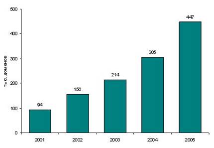 Рис.3 Число зарегистрированных доменов в зоне .RU, 2001-2005