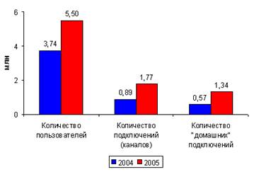 Однако если доля ШПД в «офисном» сегменте оценивается на уровне 85 %, то большая часть «домашних» пользователей (порядка двух третей) по-прежнему предпочитают dial-up. В то же время именно в секторе частных пользователей наблюдается стремительный рост — за 2005 год количество «домашних» широкополосных подключений в России увеличилось в 2,35 раза (более чем на 750 тысяч) и достигло 1335 тыс домохозяйств. Доля индивидуальных («домашних») подключений от общего количества широкополосных подключений увеличилась в 2005 г. с 64 % до 75 %; индивидуальные абоненты обеспечили более 80 % роста рынка.