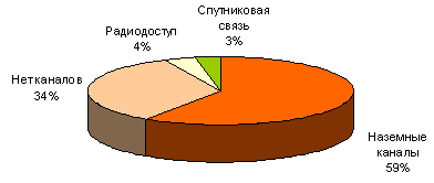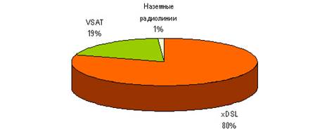Наиболее распространена при подключении школ к Интернету технология xDSL (с ее использованием подключено 80% сельских образовательных учреждений), далее следуют спутниковый доступ VSAT (19%) и наземные радиолинии (1%). При этом в тех селах, где используется технология VSAT, другая телекоммуникационная инфраструктура, как правило, полностью отсутствует.
