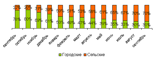 Согласно «школьному» проекту итоговое соотношение между подключенными к Сети сельскими и городскими школами должно составлять 70% и 30% соответственно, эти показатели были достигнуты в августе 2007 года рис. 11.