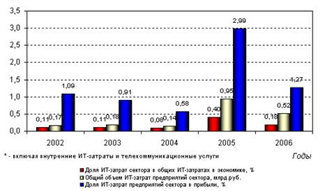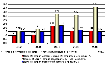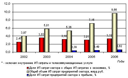 ИТ-расходы оптовиков — самые крупные в сравнении с другими отраслями торговли, более 9,6 млрд.руб. в 2006 году. По этому показателю отрасль занимает устойчивую долю в 3-3,5%% в объеме всех ИТ-затрат в экономике. При этом, по показателю доли, которую составляют ИТ-расходы в валовой прибыли (немногим более 0,6%), сектор оптовой торговли, напротив, стоит на одном из самых последних мест как среди прочих секторов торговли, так и в по сравнению с большинством отраслей российской экономики. При этом в течение последних трех лет оптовые компании все большую часть прибыли отчисляют на ИТ. Так, в 2004 году доля расходов на ИТ в секторе была ниже 0,4%.