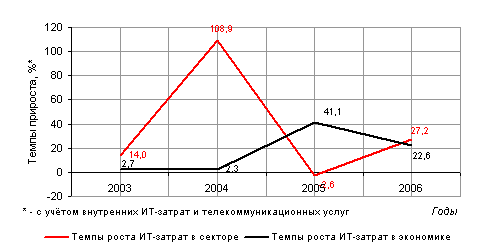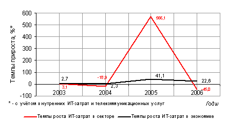 Не в пример этому, в большинстве подобных случаев — после полуторо- , двое-, троекратных и т.п. «выбросов», рынок падает гораздо сильнее, чем на 2-3%, так как, как правило, имевший место «выброс» был связан с тем или иным ситуационным явлением (например, с реализацией какой-либо крупной программы господдержки) и никаких других механизмов, способных поддержать этот новый уровень расходов не существует — они возвращаются к исходному уровню вместе с исчезновением ситуационного фактора, приведшего к их появлению. В случае розницы всё оказалось иначе — уровень остался столь же высоким, и по предварительным итогам 2006 года положительная динамика ИТ-затрат по-прежнему сохранилась рис. 16.