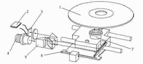 Полупроводниковый лазер (4) генерирует маломощный лазерный луч, который попадает на отражающее зеркало. Двигатель, управляемый микропроцессором CDROM Drive смещает подвижную каретку (6) с отражающим зеркалом и фокусирующей линзой (7) к нужной дорожке компакт-диска (1). Луч лазера фокусируется на поверхности CDROM с помощью линзы, а затем линза фокусирует отраженный от поверхности диска луч. Этот луч с помощью оптической системы (5) подается на фотоприемник (3), который преобразует принятые световые импульсы в электрические, которые затем соответствующим образом расшифровываются контролером (2)и передаются в компьютер в виде цифровых данных.
