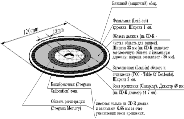 Информация на обычном CD штампованного производства распределена следующим образом: существует заголовочная область lead-in (содержит информацию об адресах дорожек, об ошибках и различную служебную информацию), непосредственно область данных и lead-out (финальная дорожка, содержащая информацию об окончании сессии записи). На дисках однократной и многократной записи существуют дополнительные информационные области, отображённые на рисунке ниже.