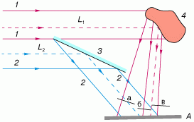 При освещении любого сколь угодно сложного предмета излучением каждая точка предмета является источником вторичных (отраженных) волн, и на достаточно больших расстояниях от предмета, значительно больших, чем размеры фотопластинки, эти волны хорошо могут быть представлены в виде плоских волн. При этом каждой точке на предмете будет соответствовать МПЭВ со своим углом падения Q' на пластинку. Если плоскость фотопластинки осветить частью излучения, которое использовалось для освещения предмета (опорный пучок), то на ней образуется система полос интерференции опорного пучка и пучков, испущенных каждой точкой предмета.