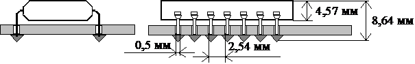 2. Корпус dip – dual in line package, – в две линии расположенные выводы (иногда этот тип корпуса называют DIL, иногда, чтобы указать, что корпус изготовлен из пластмассы – PDIP, plastic DIP), – корпус микросхемы, у которой обозначение корпуса начинается с цифры 2; выводы числом от четырнадцати до сорока двух с двух сторон микросхемы с шагом обычно 2,5 мм, изогнутые под углом 900 , припаиваются только в отверстиях печатных плат.
