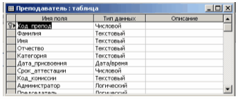 Очень важно при разработке базы данных правильно определить тип данных. В MSAccess различают следующие типы данных: Текстовый, МЕМО, Счётчик, Числовой, Логический, Денежный, Дата/Время, Поле объекта OLE .