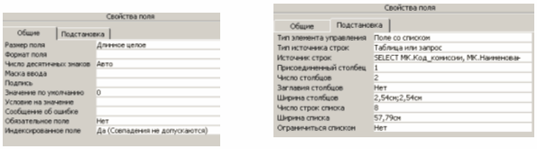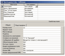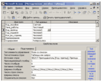 В режиме конструктора в бланке таблицы можно установить свойства полей, главные из которых Имя поля (не более 64 символа), Тип данных, Размер поля .