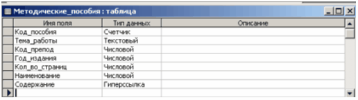 Таблица является основным структурным элементом БД. В ней хранятся все необходимые сведения. Таблицу можно создавать различными способами: в режиме конструктора, в режиме таблицы, с помощью мастера таблиц, с помощью импорта таблиц, а также можно использовать связь таблиц из другой базы данных или электронной таблицы Excel.