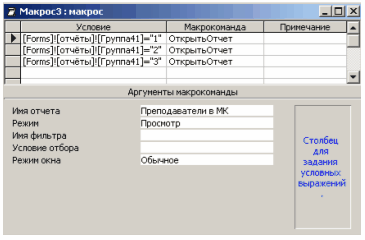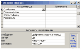 Макрос – это набор из одной или нескольких макрокоманд (иногда говорят просто – команд), выполняющих определённые операции (открытие форм, печать отчётов…). Позволяет автоматизировать повторяющиеся операции. Microsoft рекомендует для процедур автоматизации или обработки событий использовать программный код Access VBA, так как в будущем макросы использоваться не будут.