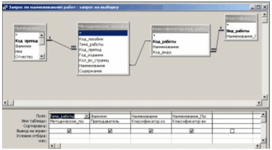 SELECTМетодические_пособия.Тема_работы, Преподаватель.Фамилия, [Классификатор код_работы].Наименование, [Классификатор вид работ].Наименование_Пособия