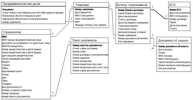 - Осуществлено проектирование структуры базы данных для хранения информации о договорах страхования предпринимательских рисков, бланках строгой отчетности, документах об оплате, страхователе, предпринимательских рисков.
