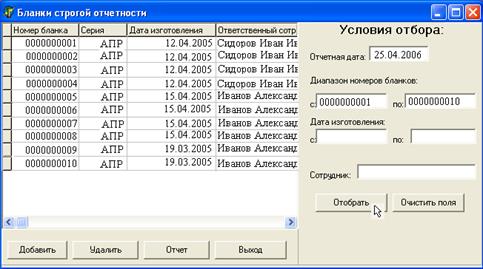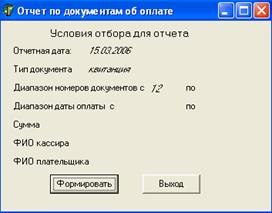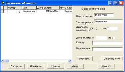 Например, на рис. 28 в условиях отбора указано в качестве "Отчетной даты" – 15.03.06 г., выбран тип документа - квитанция и выбран номер документа об оплате- 12. Это означает, что после нажатия кнопки "Отобрать" в список будет выбран документ об оплате с заданным номером, зарегистрированные в системе до 15.03.06г.