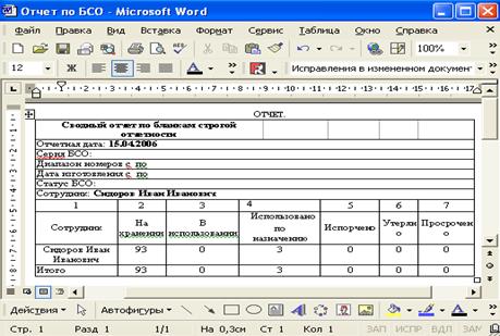 В данном окне можно просмотреть условия, на которых формируется данный отчет. Это те условия, которые были установлены в окне "Документы об оплате". Если надо их изменить, то необходимо нажать кнопку "Выход" для выхода в окно "Документы об оплате" и в условиях отбора установить другие условия отбора и сформировать список, затем снова нажать "Отчет", а лишь потом кнопку "Формировать". Открывается Word-файл с отчетом, соответствующим условиям выбора.
