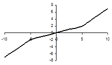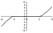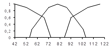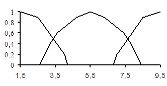 Такой график нечеткого соответствия означает, что эксперт, чьи знания были использованы при построении НР, мог выразить свою мысль следующим образом: «Я уверен, что, если Х положительно, то Y должно быть положительно и, если Х отрицательно, то Y должно быть отрицательно, но если Х близко к нулю, то Y может быть как близким к нулю, так и отрицательным, так и положительным – наверно, это зависит от дополнительных неучтенных условий (например, от производной Х по времени)».