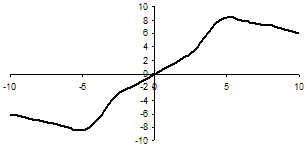 Наиболее интересным является ограниченный базис, поскольку изменение графика нечеткого соответствия в этом случае может качественно повлиять на характеристики системы. Наглядным примером тому служит зависимость, изображённая на рис. 3. Как видно из этого рисунка, статическая характеристика имеет два участка, где коэффициент передачи отрицателен, т. е. при попадании на эти участки система теряет устойчивость (несмотря на то, что все промежуточные операции на первый взгляд кажутся монотонными). Как показал анализ эта немонотонность обусловлена способом дефаззификации.