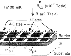 Єдиним малим донором у Sі зі спіном І=1/2 є 31 Р. Система Sі: 31 Р була вивчена 40 років тому в експериментах по електрон-ядерному подвійному резонансі. При досить низькій концентрації 31 Р і при Т=1,5 К час релаксації електронного спіну порядка тисяч секунд, а час релаксації ядерного спіна 31 Р перевищує 10 годин. Очевидно, при температурі в області мілікельвінів час релаксації 31 Р, обмежений фононами, буде порядку 1018 секунд, що робить цю систему ідеальною в цьому випадку для квантових обчислень. Умови, необхідні для обчислень за допомогою ядерних спінів, можуть виникнути, якщо ядерний спін локалізований на позитивно зарядженому донорі в матриці напівпровідника, отже, температура повинна бути настільки низькою, щоб виключити іонізацію донора. По розрахунках Кейна необхідна температура для роботи повинна бути менш 0.1 К. Пластина кремнію при цій температурі ставиться в постійне магнітне поле В0 >2Т або В0 =2Т (рис.2.1). У цих умовах електрони будуть практично цілком спін-поляризовані, а ядерні спіни будуть упорядковуватися в міру взаємодії з електронами.
