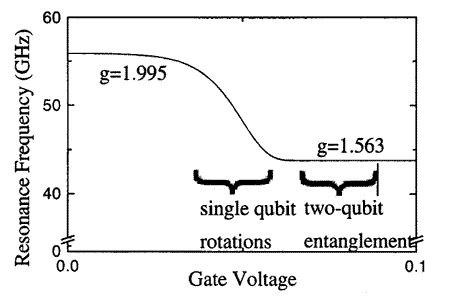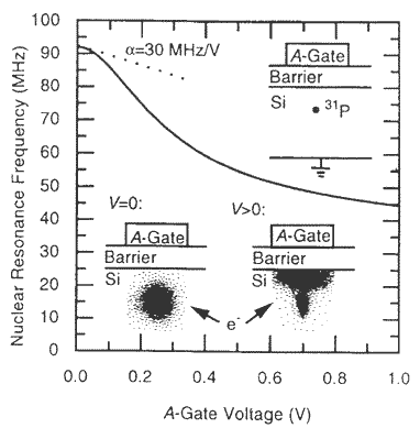 Таким чином, прикладання напруги до затвора А приводить до зміни резонансної частоти, внаслідок чого спіни можуть бути селективно приведені в резонанс із В0 , що дозволяє проводити одночасні, довільні обертання кожного ядерного спіна, тобто здійснювати однокубітні операції.