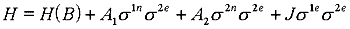 де Н(В) - член взаємодії магнітного поля зі спинами, А1 і А2 - енергії надтонкої взаємодії відповідних систем ядро-електрон, s - спінові матриці Паулі, індекси 1 і 2 відносяться до першого і другого кубіту, індекси e і n – до електрона і ядра, а 4J - обмінна енергія, що залежить від перекриття хвильових функцій електронів. Для добре розділених донорів: