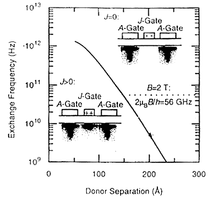 і ця умова вимагає поділу між донорами на відстань 100-200 А. Однак у дійсності ця відстань може бути більше, тому що до "J-затвора" може бути прикладений позитивний потенціал, що зменшує бар’єр між донорами. Розміри затвора, необхідні для квантового комп’ютера близькі до обмеження електронної технології.
