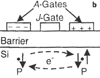 Це обмеження визначається розривами зони провідності між шарами D2 і В, і Т, і В, що рівні 20 меВ. Обмеження бар’єром відіграє важливу роль. Воно зберігає кубітні донорні електрони протягом довгого часу, не допускаючи втрат як носіїв, так і квантової інформації. Для цього товщина бар’єра складає 200 А, при цьому час життя порівнянний з часом спін-решіткової релаксації Т1 (1 година). Обидва шари товщиною 400 А співпадають з границею, обмеженою напругами ≈ 1000 А для х = 0,23. Шари D і T мають товщину порівнянну з aВ , z - вертикальним Борівським радіусом і вносять слабкий вклад у виникаючі напруги. Дуже важливо, що між шарами D2 і Т розрив зон дорівнює нулеві, так що немає перешкод для переміщення електрона із шару D2 у шар Т. У шарі D1 (перший донорний шар) перпендикулярно площини малюнка розміщені канали МДН транзисторів, що служать для реєстрації сигналу наприкінці обчислень і просторово розташовані під атомами фосфору.