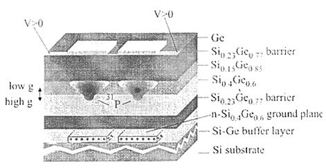 2)Замість кремнію використовуються епітаксіальні Sі/Ge гетероструктури (ГС), електронною структурою яких можна керувати шляхом зміни складу. Ці напружені ГС, виробництво яких зараз широко розвивається в усьому світі, знаходяться в головному руслі кремнієвої технології і в даний час використовуються для виробництва високочастотних компонентів бездротового зв’язку. У композиційно модульованої Sі/Ge ГС через різницю в електронному g-факторі (g=1.995 для Sі і g=1.563 для Ge) електронний спіновий резонанс може підбудовуватися електростатичним затвором, а можливість штучного створення необхідної енергетичної структури зони провідності дозволяє виділити бар’єрні області.
