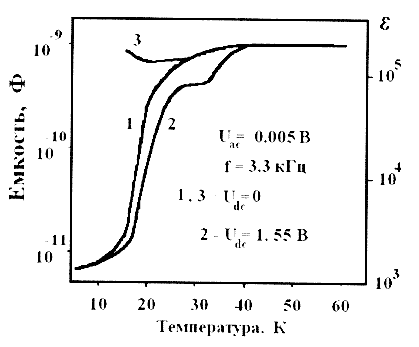 Рис. 3.4. Температурна залежність ємності і діелектричної проникності Pb1-х Snх Te від температури. 1,2 – у темряві, 3 – при освітленні.