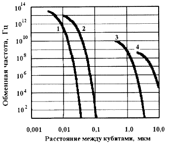 Як видно з малюнка обмінна частота для випадку, коли в розрахунку використовуються значення діелектричної проникності й ефективної маси, що відповідають СОТ (In) зі складом х =0,24, зберігає досить високе значення навіть тоді, коли відстань між кубітами збільшується майже до 10 мкм.