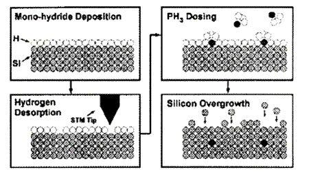 З’явилися публікації про рішення однієї із складних проблем у створенні кубіта на атомах фосфору в кремнії - точне розташування цих атомів у матриці кремнію на відстанях усього сотні ангстрем. На Рис.3.6 приведена схема процесу такого розміщення атомів, успішно застосованого австралійською групою вчених у "Центрі технології квантового комп’ютера" у Сіднею.