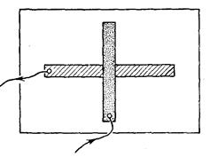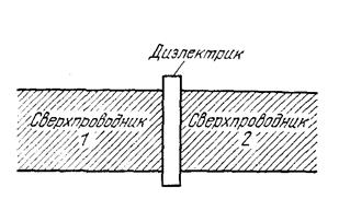 Рис.4.1.Тунельний перехід, що складається з двох надпровідників, розділених тонким шаром діелектрика [9]. Цим шаром можуть служити шари окислів товщиною порядку 10 А на поверхні одного з надпровідників. Реальний тунельний перехід може бути виконаний у виді двох схрещених смужок свинцю, нанесених осадженням на скляну пластинку. Перша смужка витримується на повітрі до утворення плівки окислу; потім перпендикулярно до першої наноситься тим же шляхом друга смужка. Електричний опір переходу може бути порядку 1 Ом; площа контакту 10-4 см2 ; максимальний джозефсонівський струм - порядку 1 мА. Земне магнітне поле викликає шкідливий ефект дефазіровки на контакті, тому в експерименті необхідно приймати заходи для екранування цього поля.