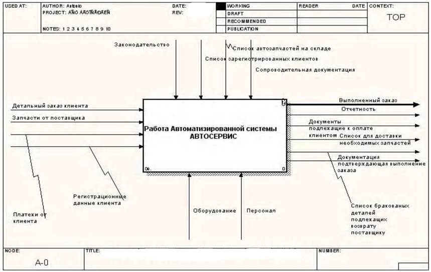 В своей системе я хотел бы представить деятельность как автоматизированный проект заказа запчастей и работ, слежки за выполнением заказа, а также ведением финансовой бухгалтерии.