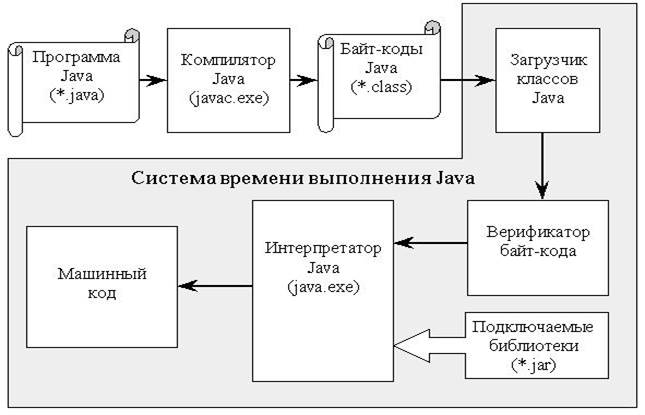 После такой проверки на безопасность байт-код интерпретируется в машинный код и запускается на выполнение интерпретатором. Причём классы, полученные локально (заслуживающие безусловного доверия), и классы, присланные по сети из остального мира (и потенциально враждебные), находятся в разных пространствах имён. При разрешении ссылки на какой-либо класс он ищется прежде всего в локальном пространстве. Это не позволяет "внешним" кодам подменить один из базовых классов в системе. Также в процессе интерпретации происходит подключение необходимых библиотек (файлы с расширением jar). Весь описанный процесс исполнения Java программ изображён на рис. 1.