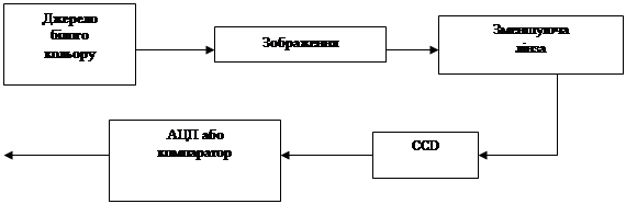 Принцип роботи чорно - білого сканера полягає в слідую чому: зображення, що сканується освітлюється білим світлом. Відображене світло через зменшувальну лінзу попадає фото чуттєвий напівпровідниковий елемент, який називається Пристроєм з зарядним зв’язком - ПЗЗ (Charge - Сoupled Device, CCD). Кожен рядок сканування відповідає окремим значенням напруги на ПЗЗ. Ці значення напруги перетворюються в цифрову форму або через аналого - цифровий перетворювач АЦП (для пів тонових сканерів), або через компаратор (для дворівневих сканерів). Розрядність АЦП для пів тонових сканерів залежить від кількості підтримуючих рівнів сірого кольору. Блок - схема чорно - білого сканера наведена на мал.1.