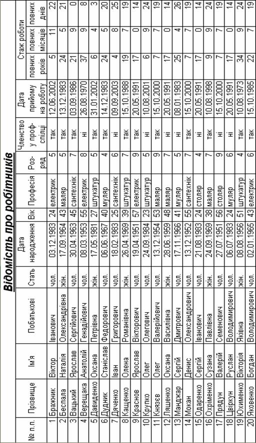 2). Відомість про робітників. Розробити таблицю, яка має містити наступні поля: № п.п., прізвище, ім’я, по батькові, стать, дата народження (забезпечити введення даних між датами 01.01.1950р. і 01.01.1985р.), вік, професія, розряд, членство у профспілці, дата прийому на роботу, стаж роботи (визначається в повних роках, місяцях, днях). Кількість записів в таблиці відповідає чисельності бригади, що складає 20 чол.